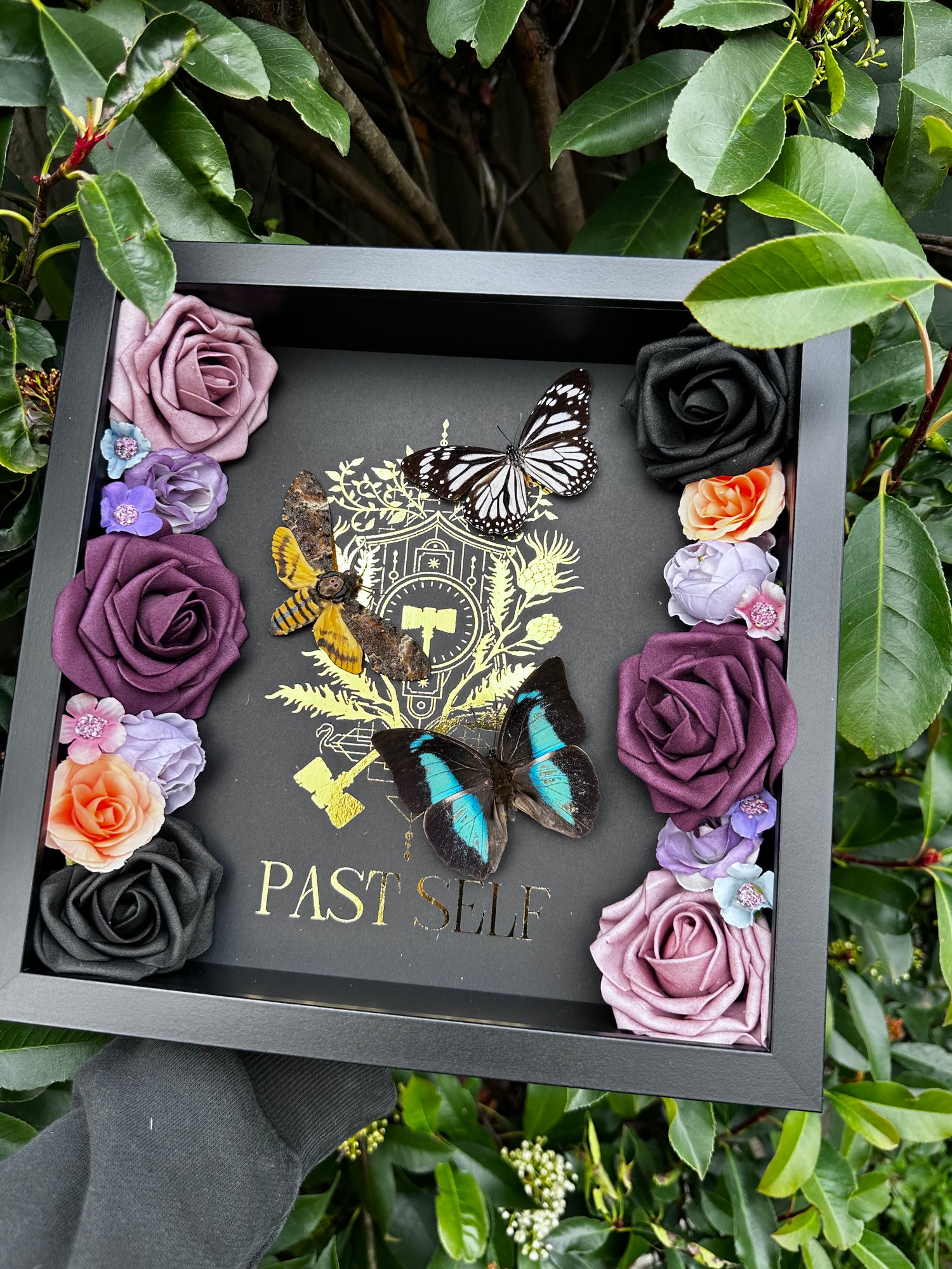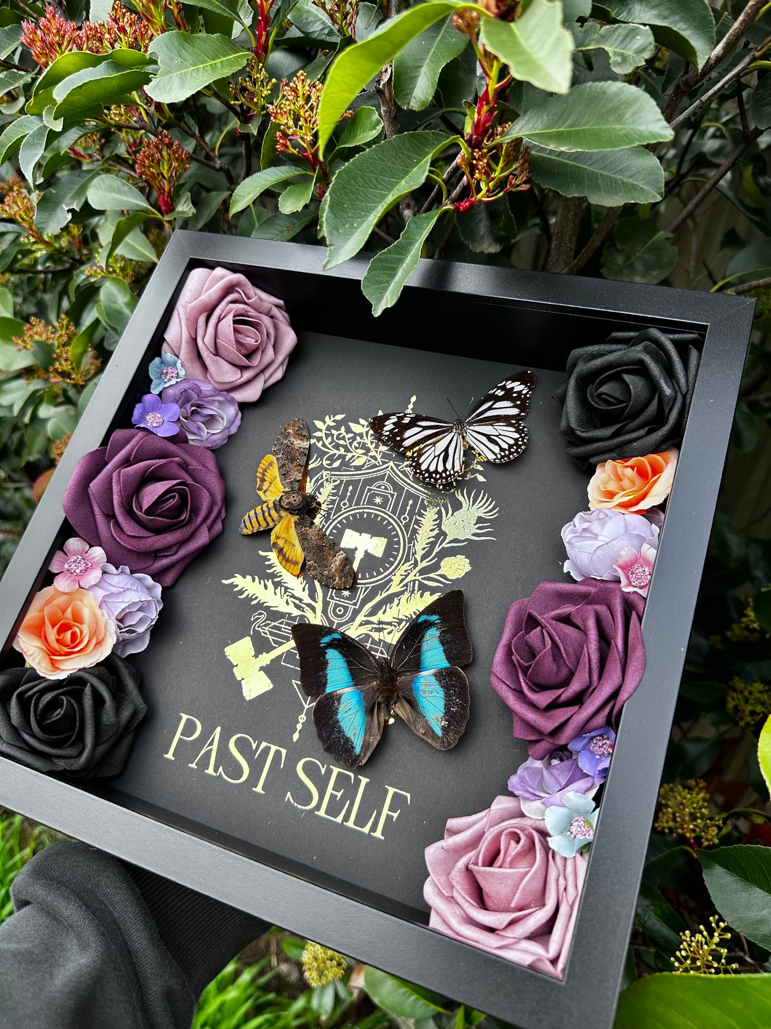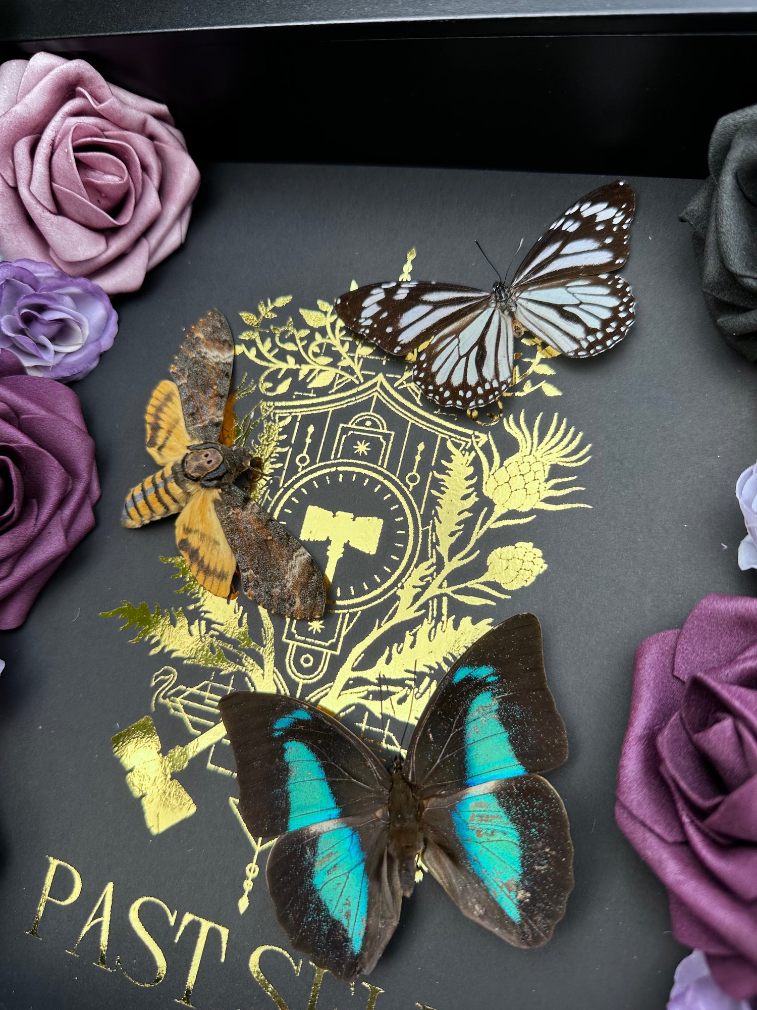 Frame Specs: Situated in a 125x25cm black depth frame with a gold foiled background 'Past Self' emblem. Inside is a gorgeous Acherontia Styx (Deaths Head Moth)Prepona Demophan and a Danaus Melanipus Edmondii