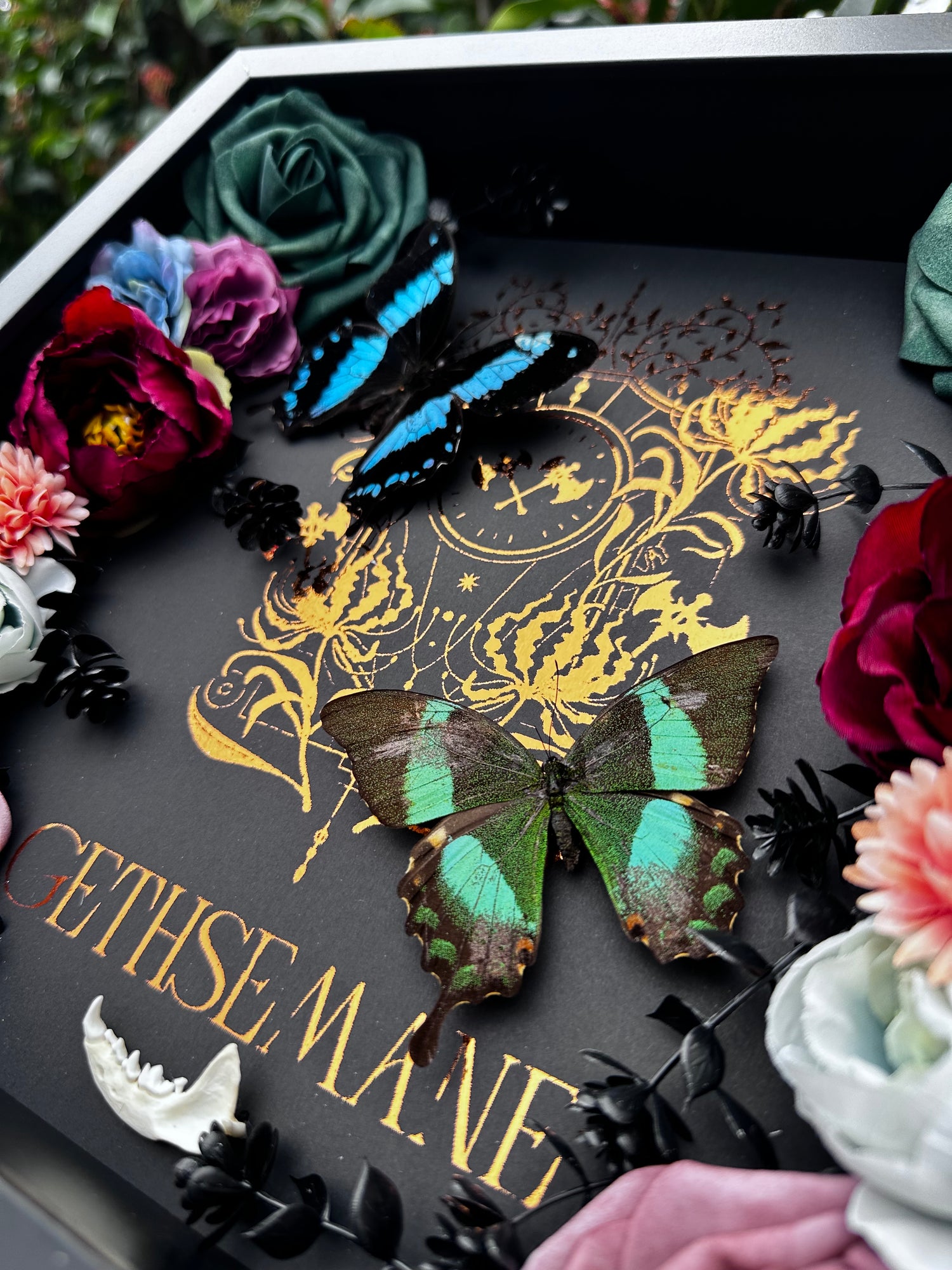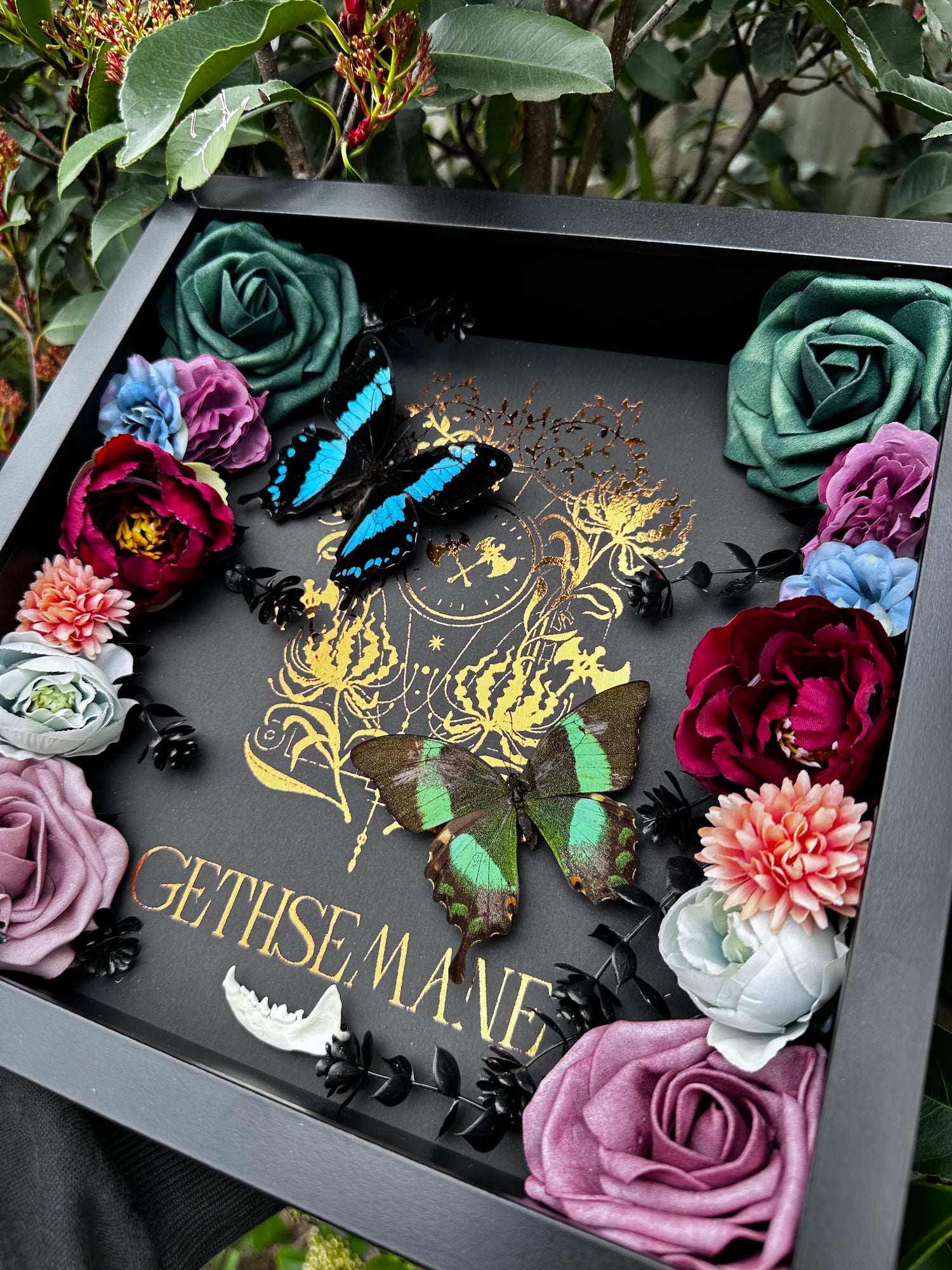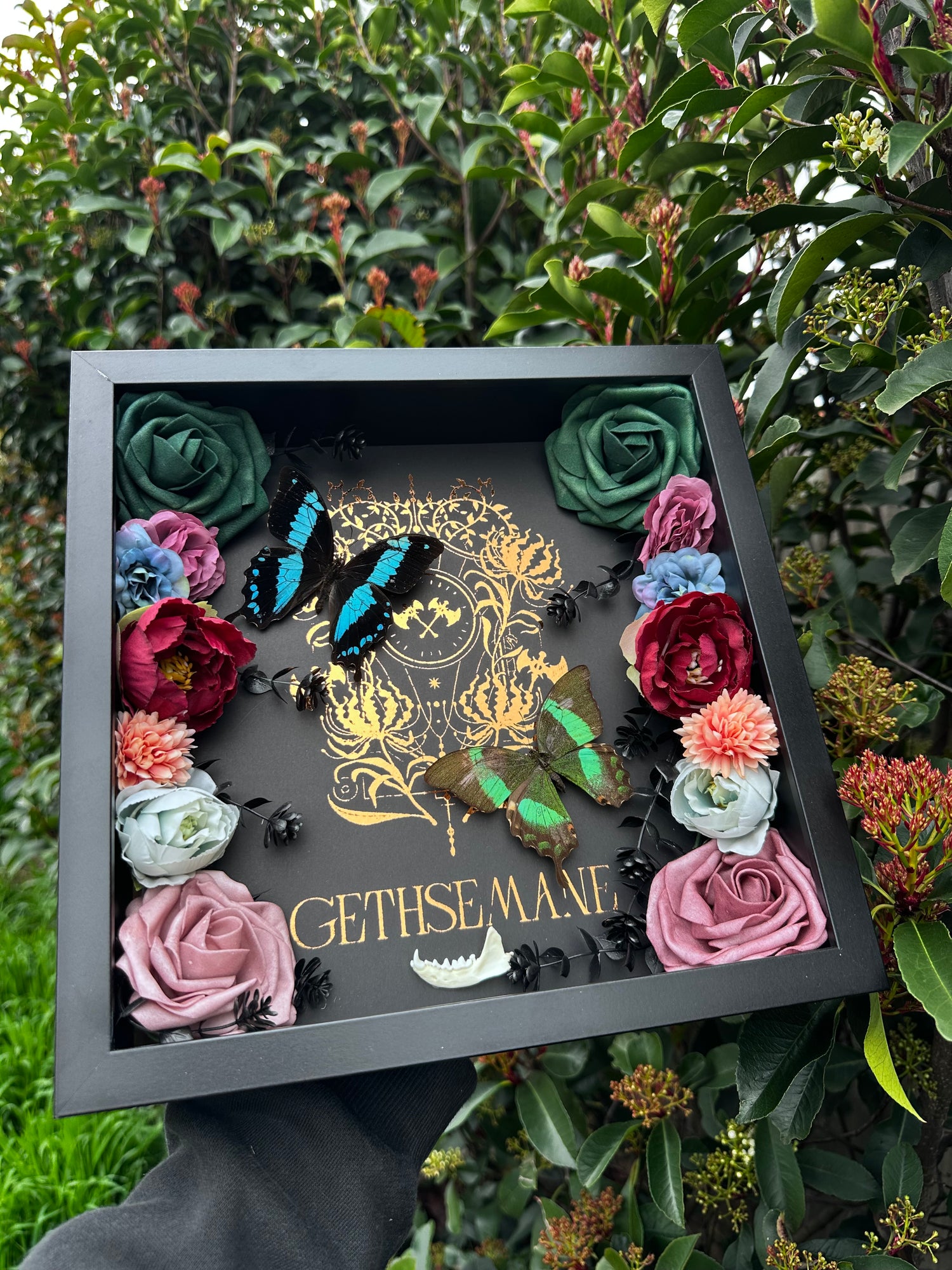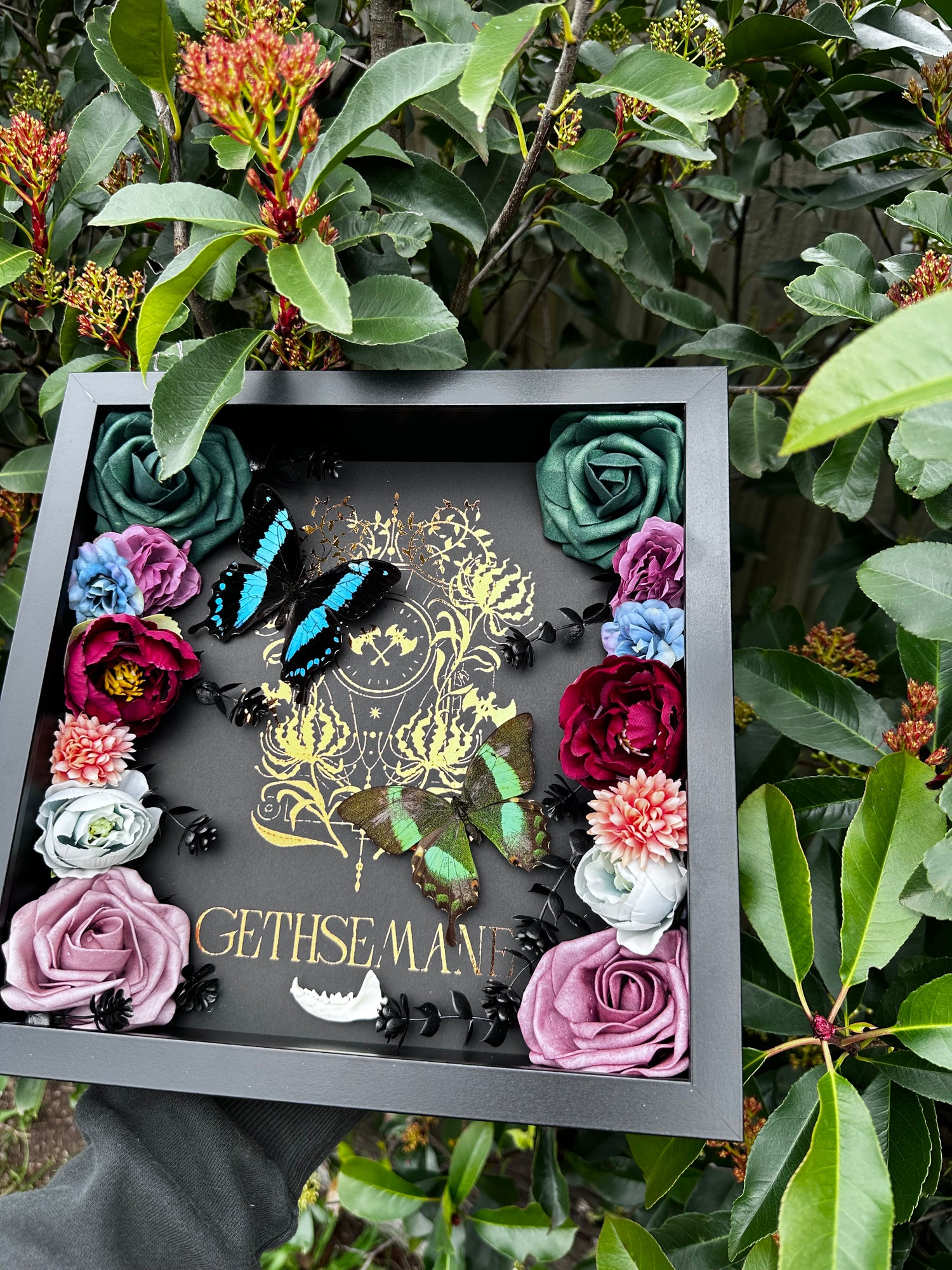 Gethsemane is featured on this frame along with some gorgeous florals and 2 magnificent vibrant butterflys and the jaw of a rodent (legal to own)