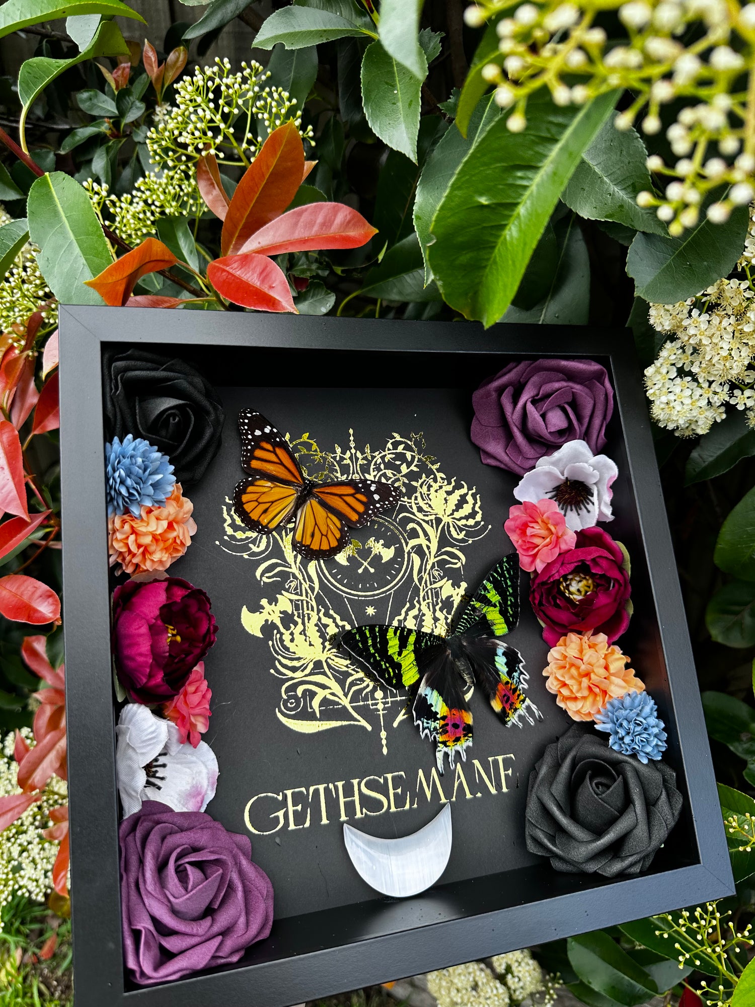 Gethsemane is featured on this frame along with some gorgeous florals and 2 magnificent vibrant butterflys and the jaw of a rodent (legal to own)