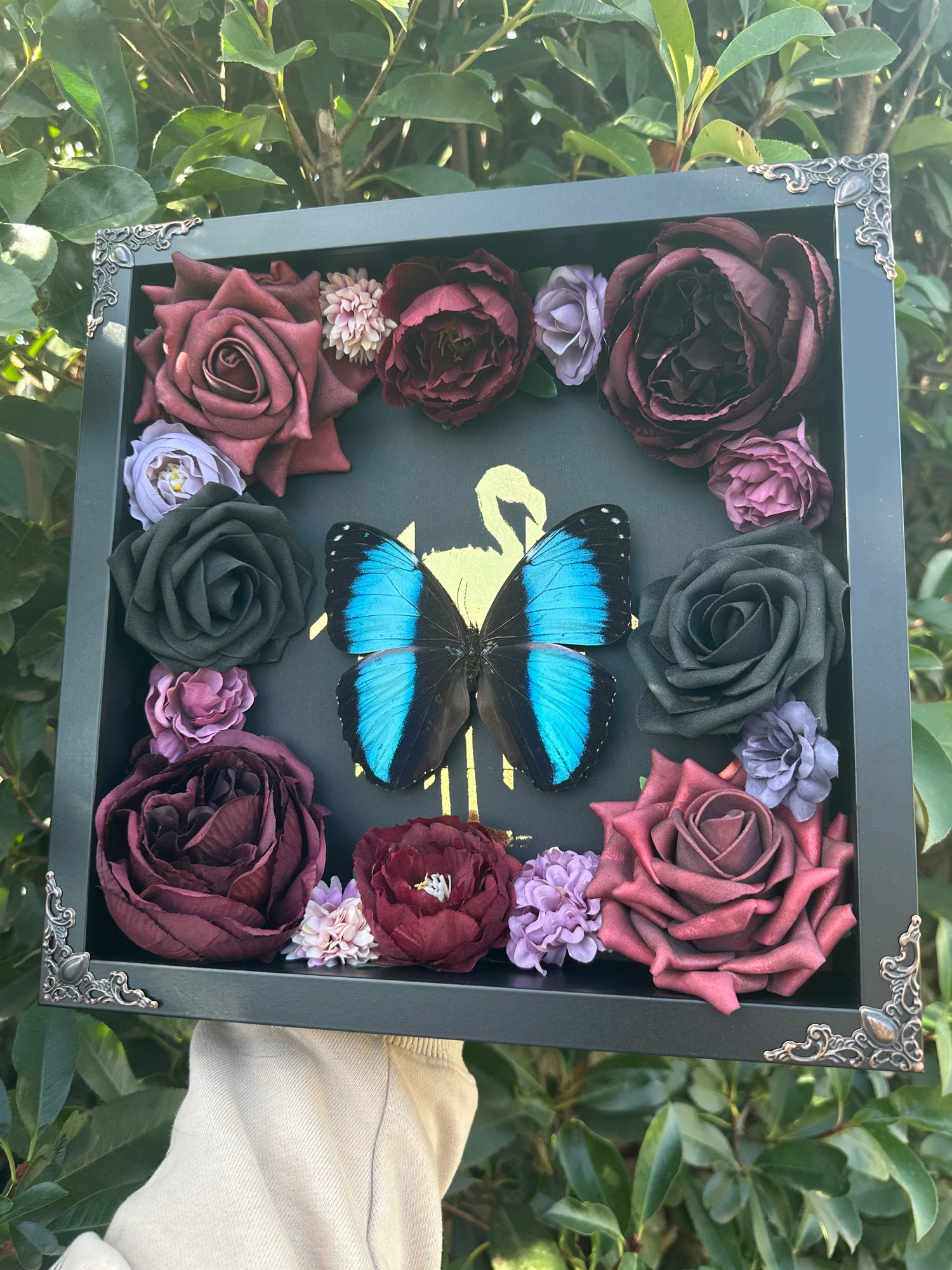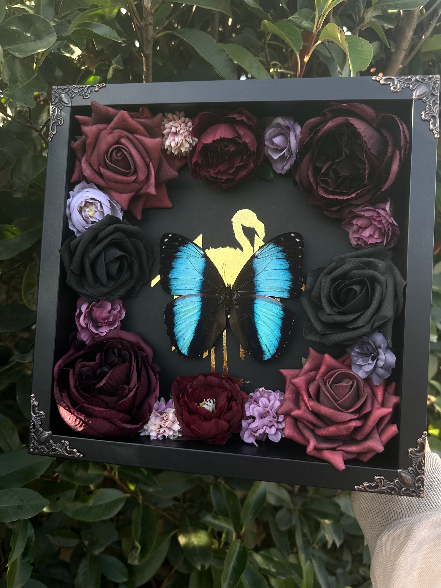 Frame Specs: Situated in a black depth frame 25x25cm on a black background with a sleep token foiled design. It is finished off with florals to compliment the release of Even in Arcadia.
