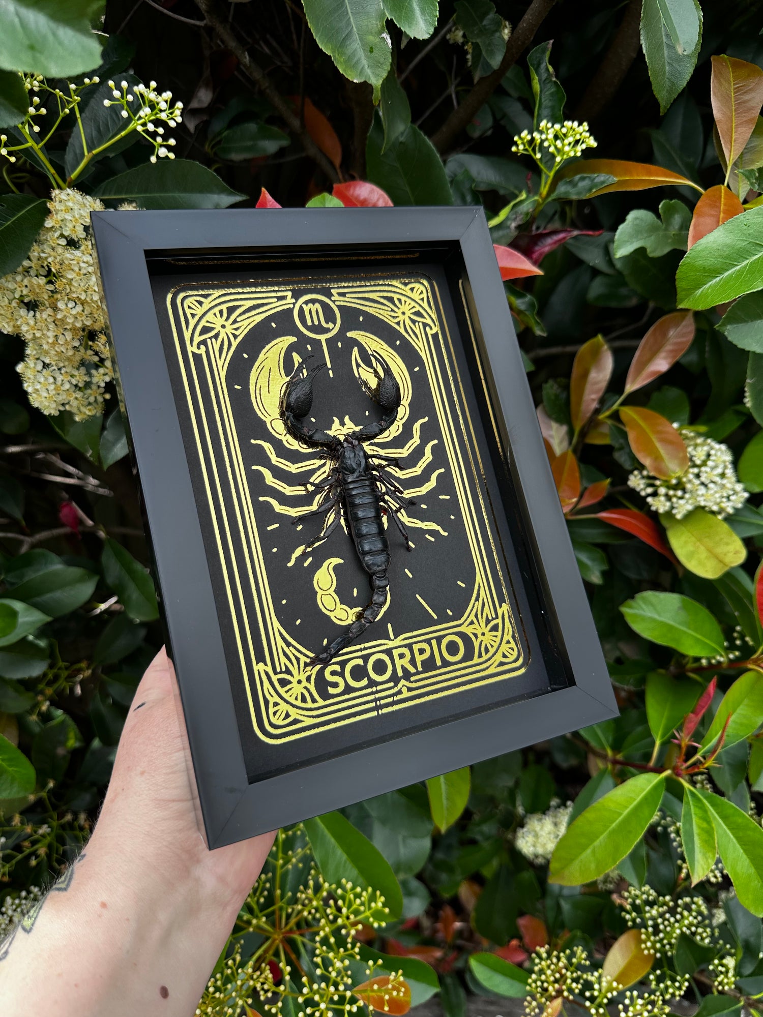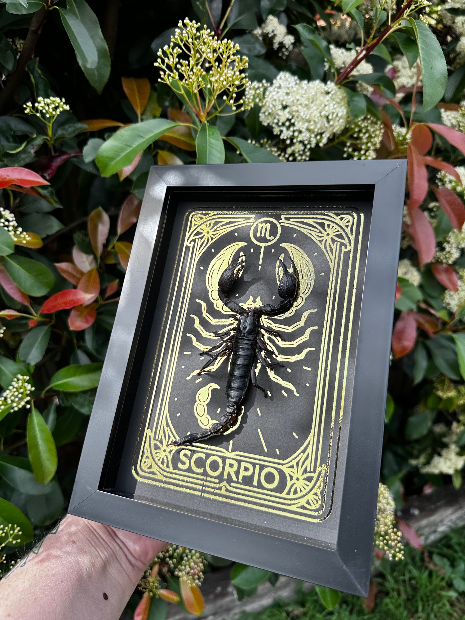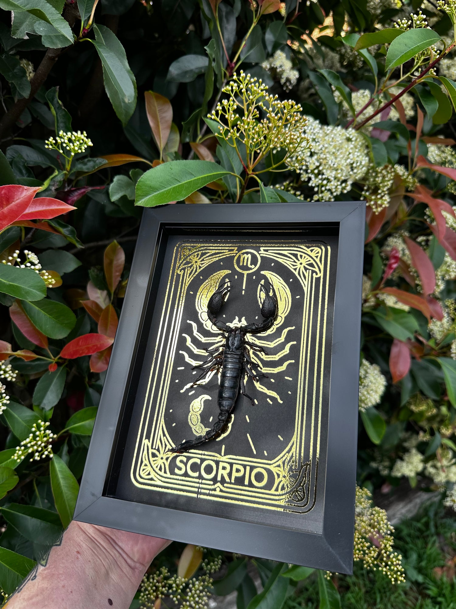 Frame Specs: Black depth frame 20x15cm with a black background and gold foiled Scorpio background
