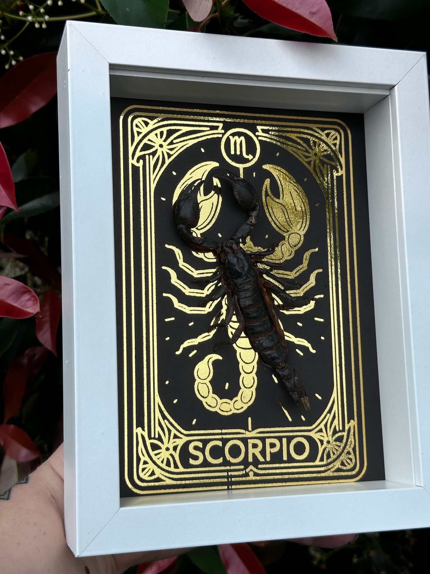 Frame Specs: White depth frame 20x15cm with a black background and gold foiled Scorpio